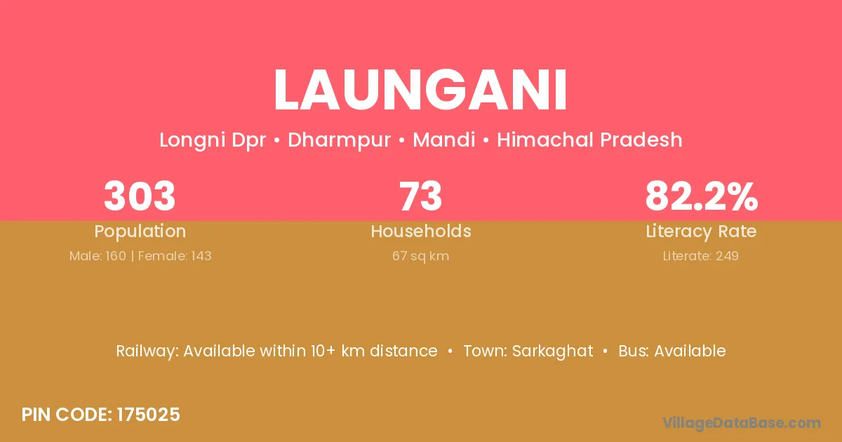 Laungani village has a total population of 303 people, of which 160 are males and 143 are females.