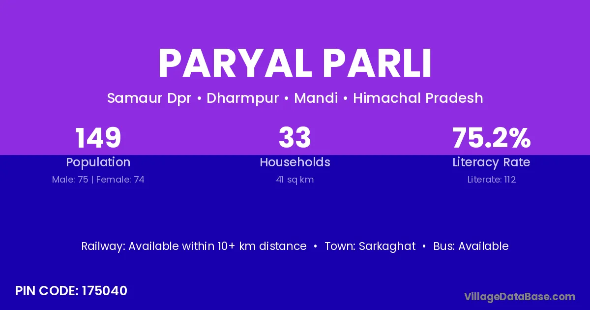 Paryal Parli village has a total population of 149 people, of which 75 are males and 74 are females.