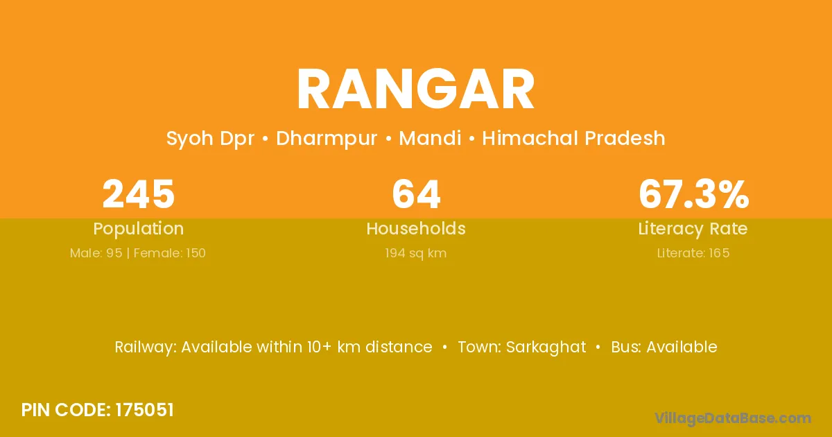 Sarkaghat is the nearest town to Rangar village for major economic activities