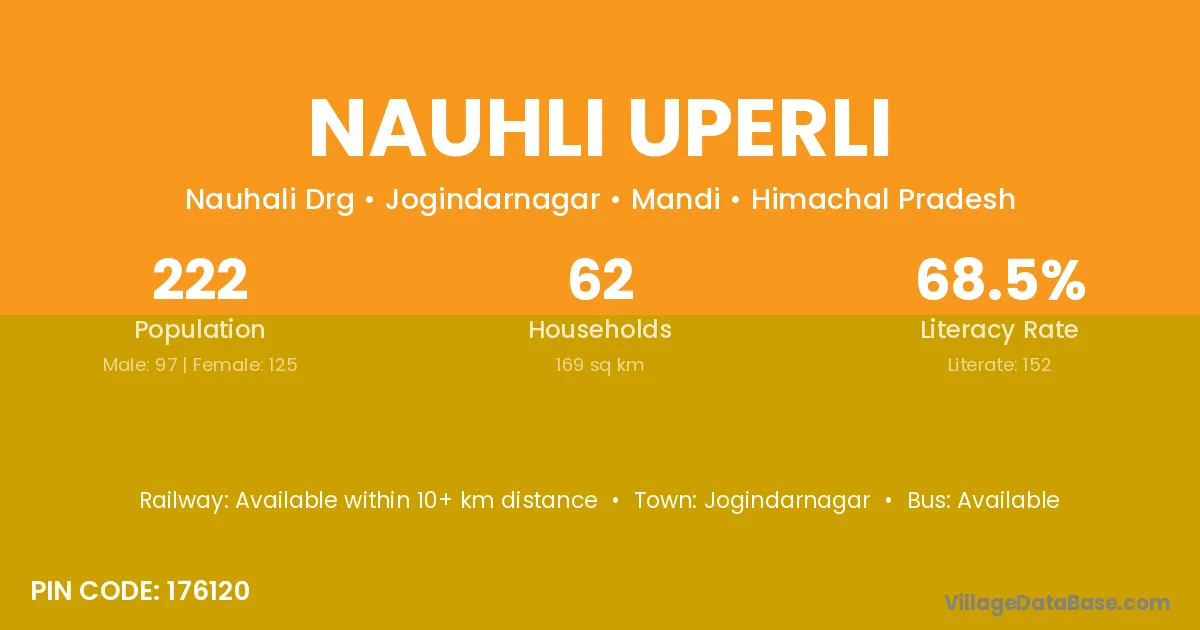Nauhli Uperli village has a total population of 222 people, of which 97 are males and 125 are females.