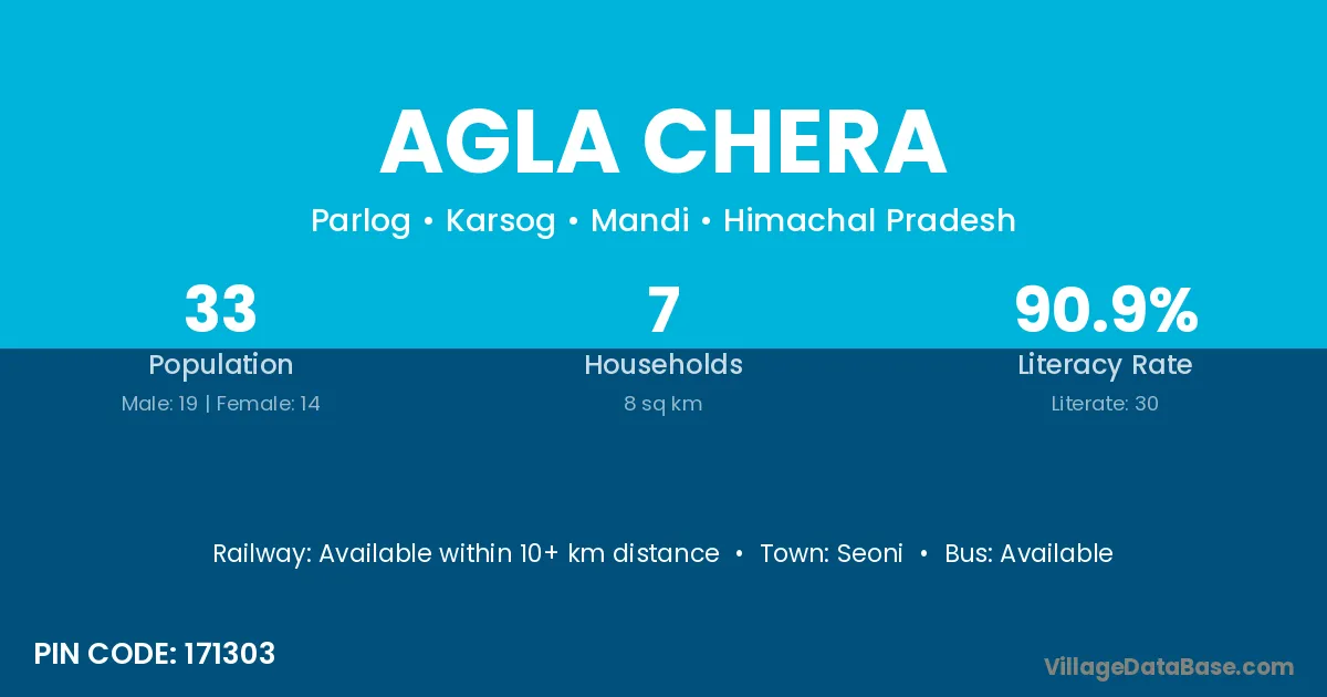 Seoni is the nearest town to Agla Chera village for major economic activities