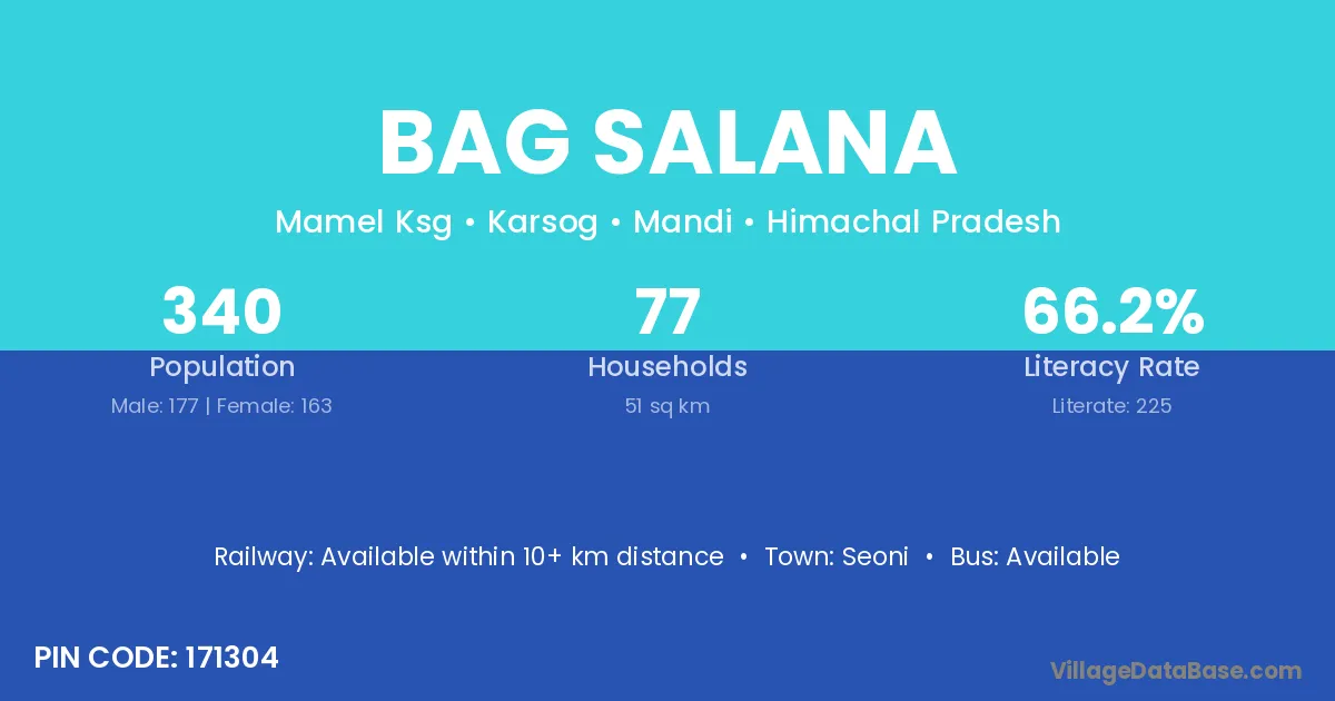 The literacy rate of Bag Salana village is 66.18%. Male literacy stands at 79.66% and female literacy at 51.53%.