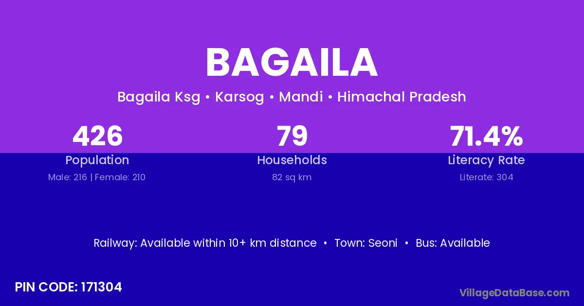 Bagaila village has a total population of 426 people, of which 216 are males and 210 are females.