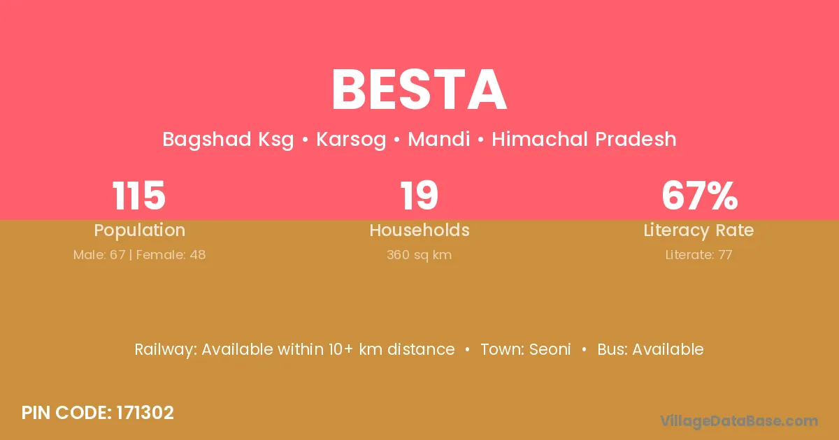 Besta village has a total population of 115 people, of which 67 are males and 48 are females.