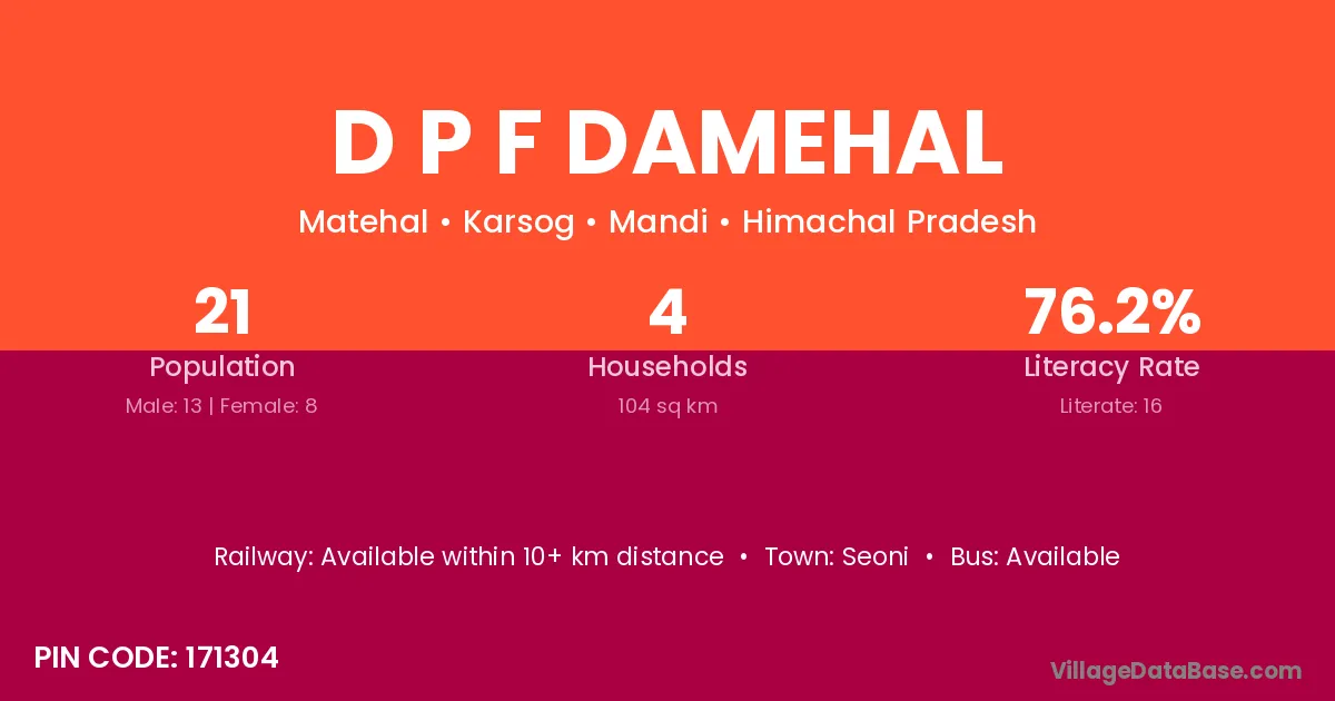 D P F Damehal village has a total population of 21 people, of which 13 are males and 8 are females.