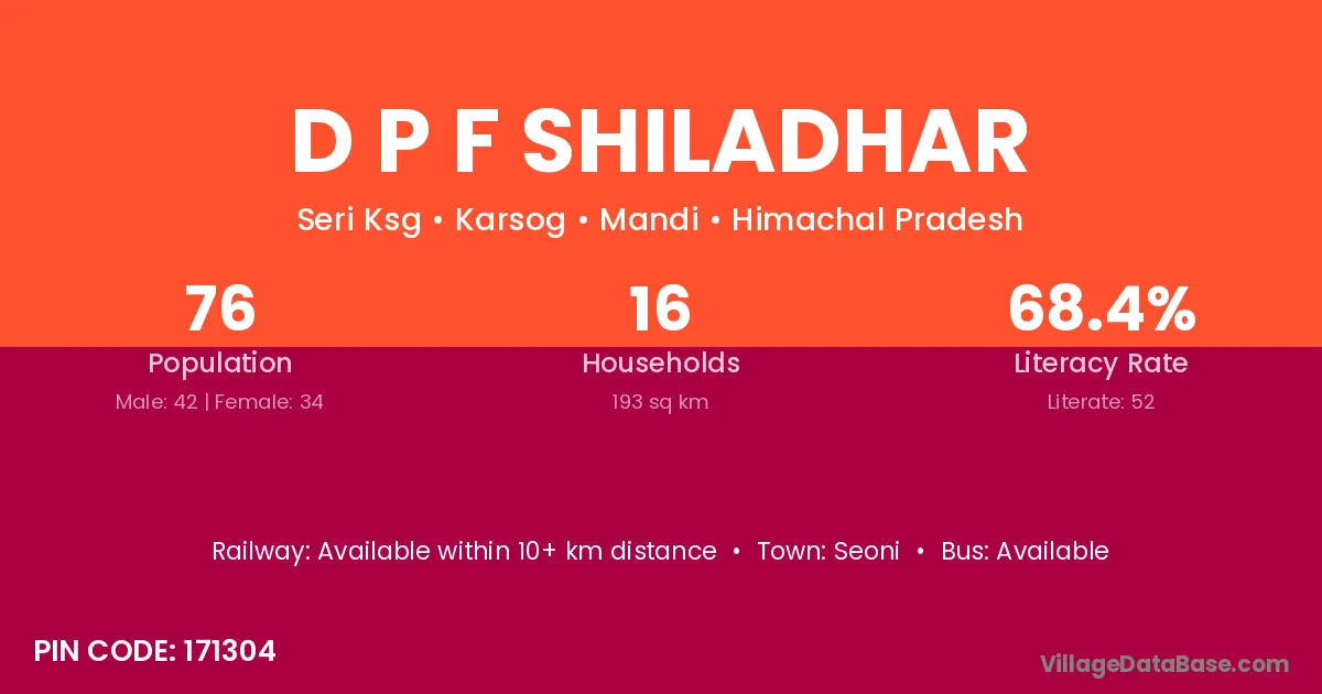 D P F Shiladhar village has a total population of 76 people, of which 42 are males and 34 are females.