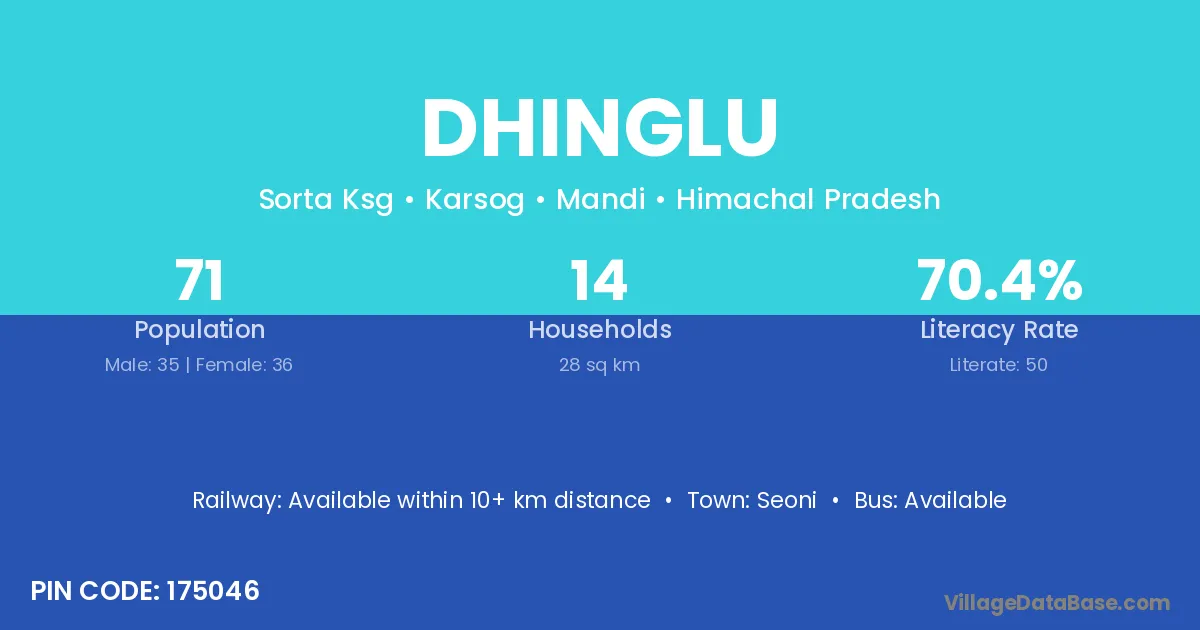 Dhinglu village has a total population of 71 people, of which 35 are males and 36 are females.