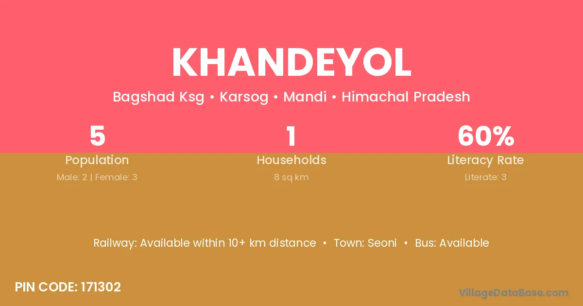 Khandeyol village has a total population of 5 people, of which 2 are males and 3 are females.