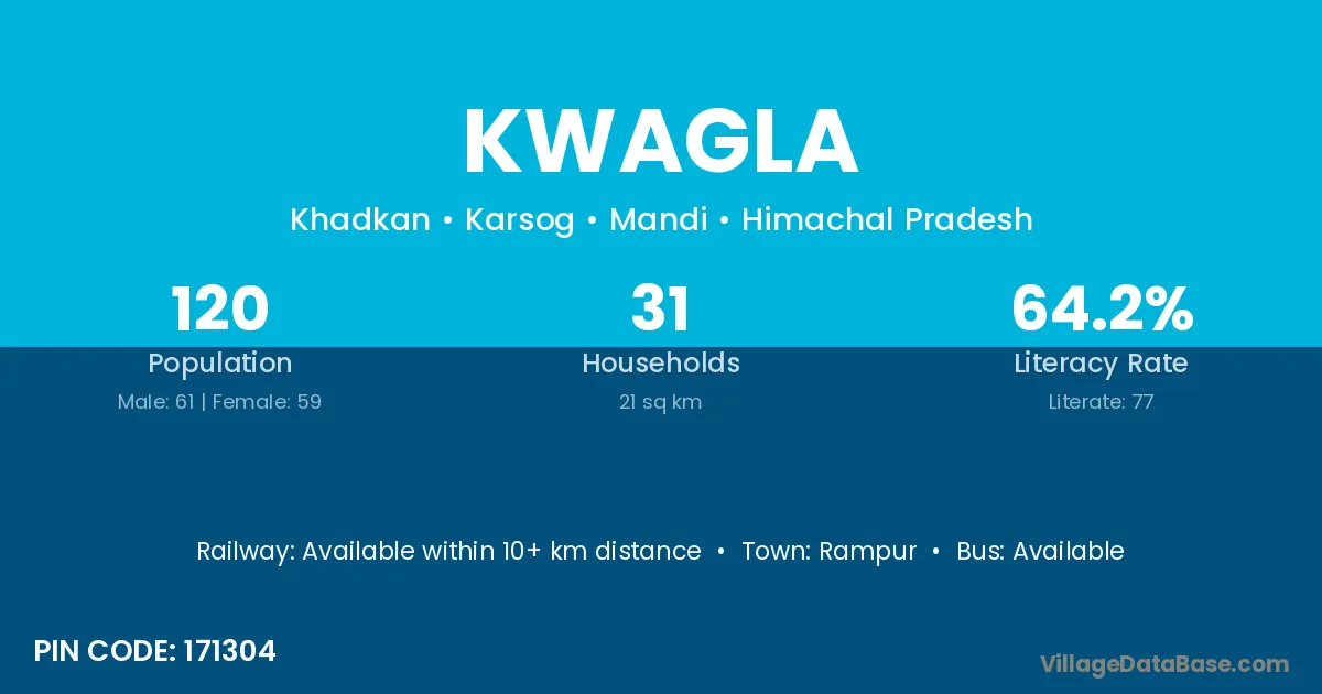 Kwagla village has a total population of 120 people, of which 61 are males and 59 are females.