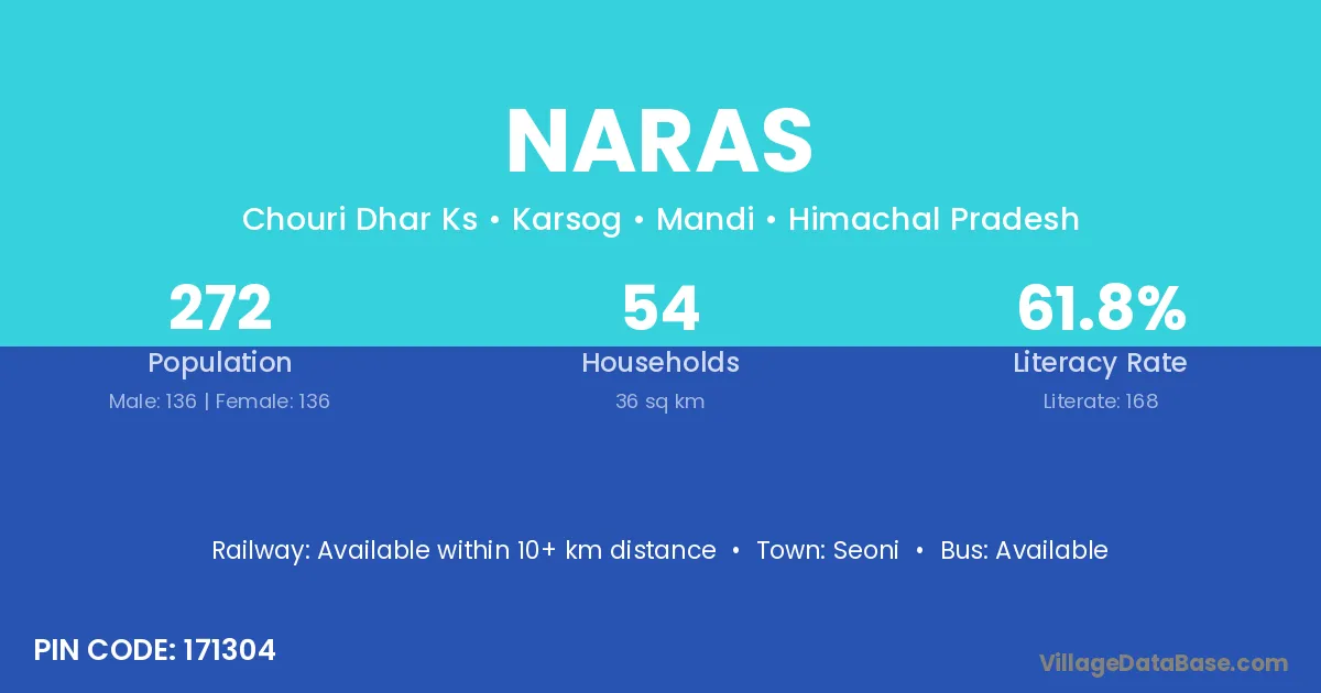 Naras village has a total population of 272 people, of which 136 are males and 136 are females.