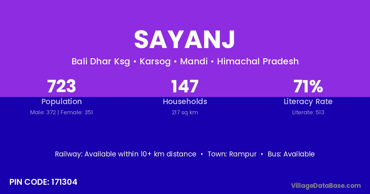 Sayanj village has a total population of 723 people, of which 372 are males and 351 are females.