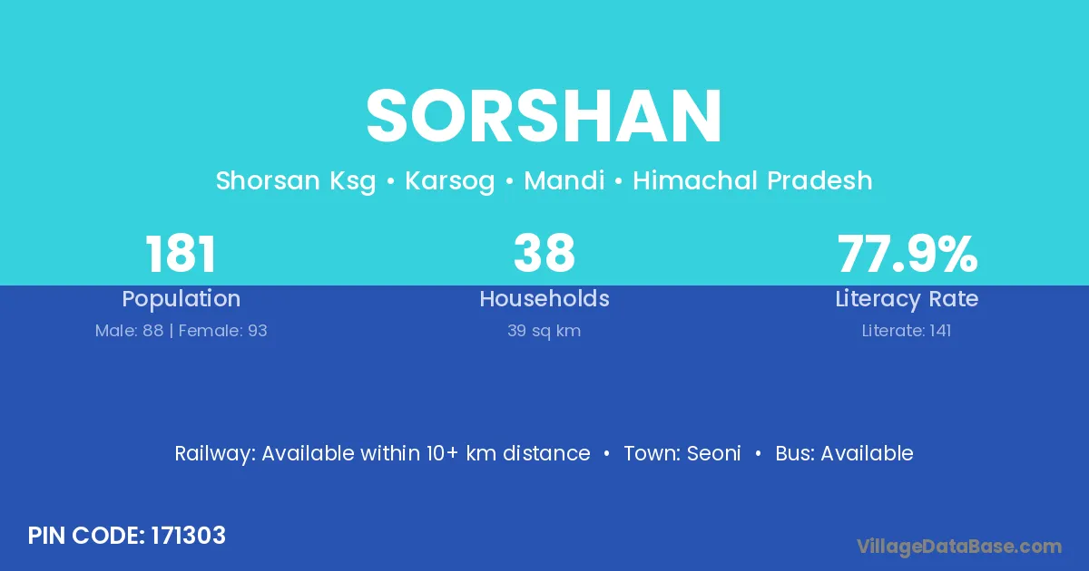 Sorshan village has a total population of 181 people, of which 88 are males and 93 are females.