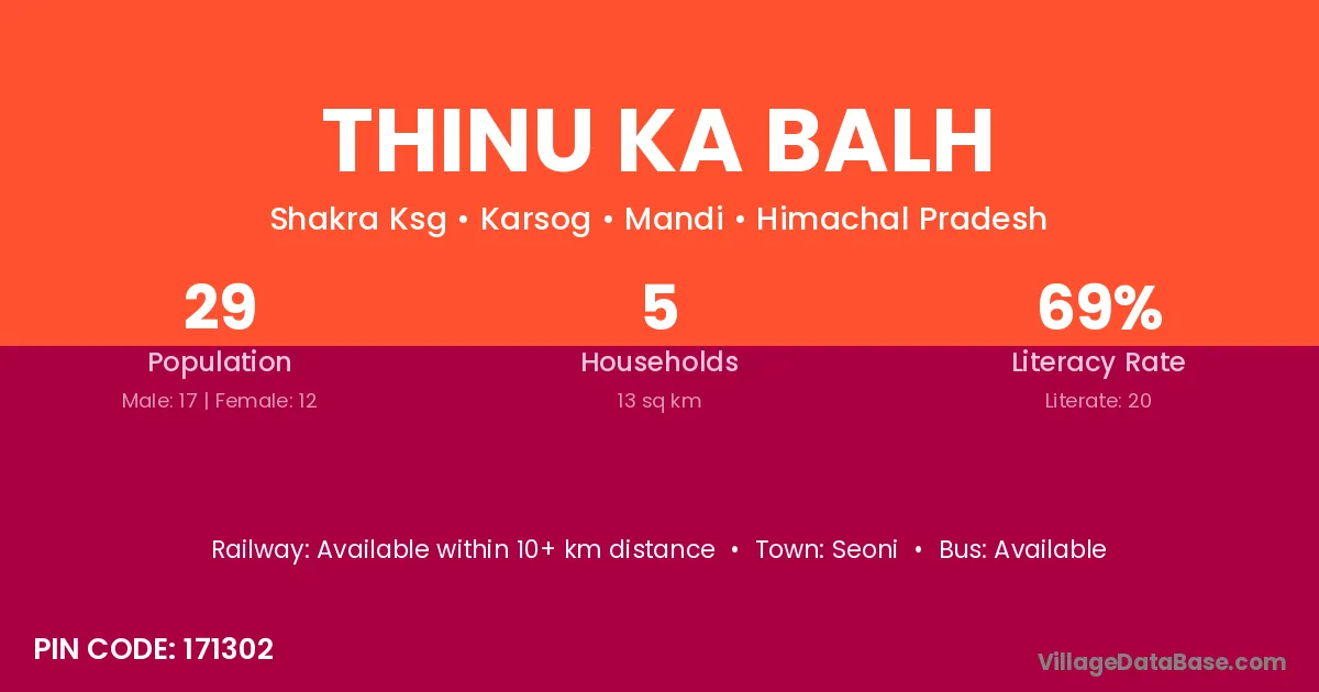 Thinu Ka Balh village has a total population of 29 people, of which 17 are males and 12 are females.