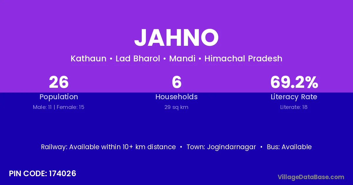 Jahno village has a total population of 26 people, of which 11 are males and 15 are females.