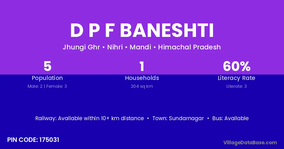 D P F Baneshti village has a total population of 5 people, of which 2 are males and 3 are females.