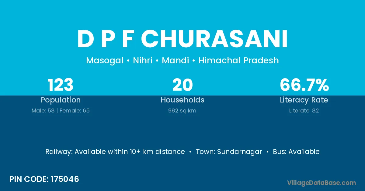 D P F Churasani village has a total population of 123 people, of which 58 are males and 65 are females.
