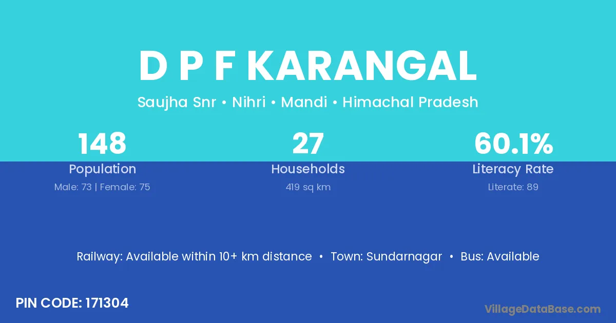 D P F Karangal village has a total population of 148 people, of which 73 are males and 75 are females.