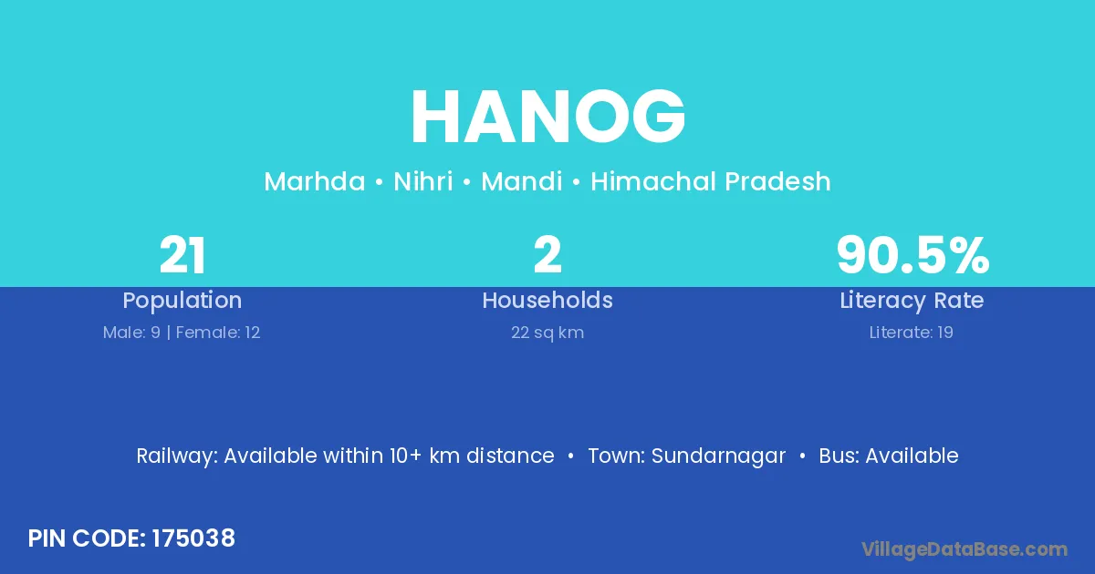 Hanog village has a total population of 21 people, of which 9 are males and 12 are females.