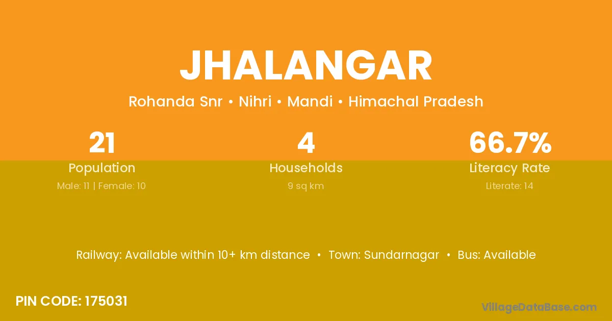 Jhalangar village has a total population of 21 people, of which 11 are males and 10 are females.