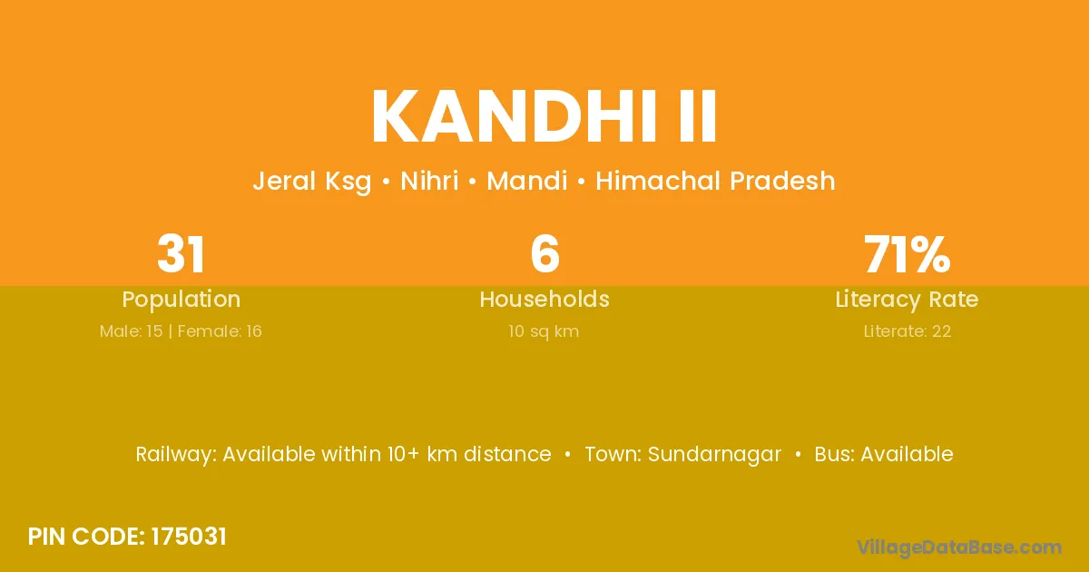 Kandhi Ii village has a total population of 31 people, of which 15 are males and 16 are females.