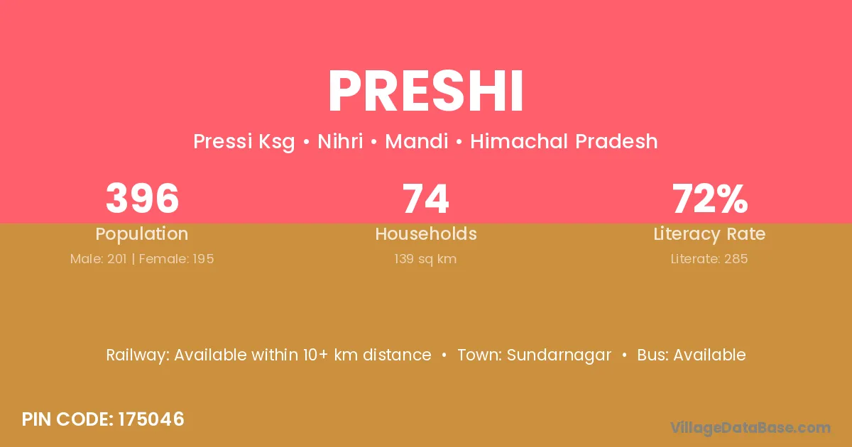 Preshi village has a total population of 396 people, of which 201 are males and 195 are females.