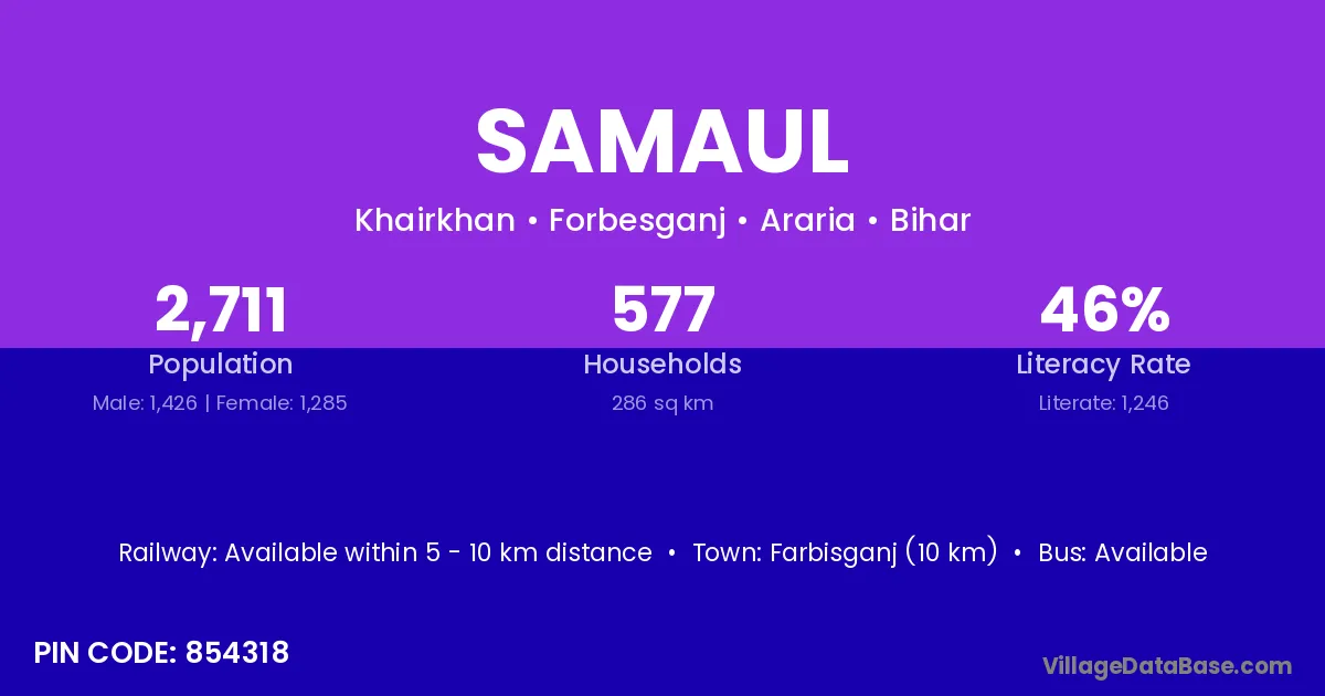 The literacy rate of Samaul village is 57.06%. Male literacy stands at 66.27% and female literacy at 48.28%.