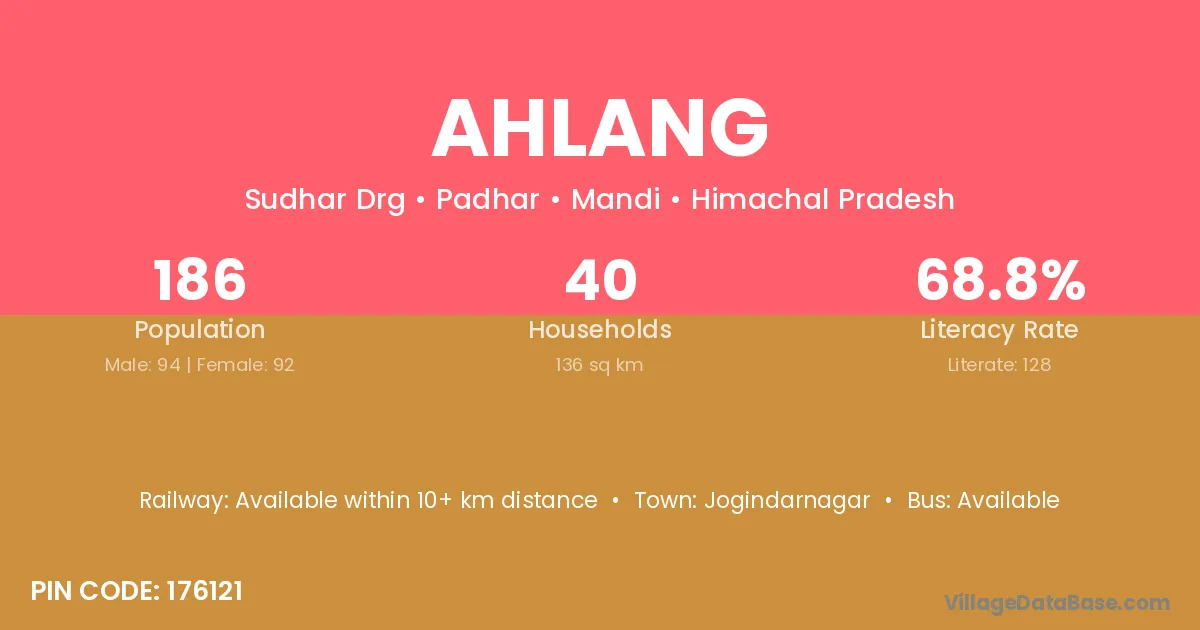 Ahlang village has a total population of 186 people, of which 94 are males and 92 are females.