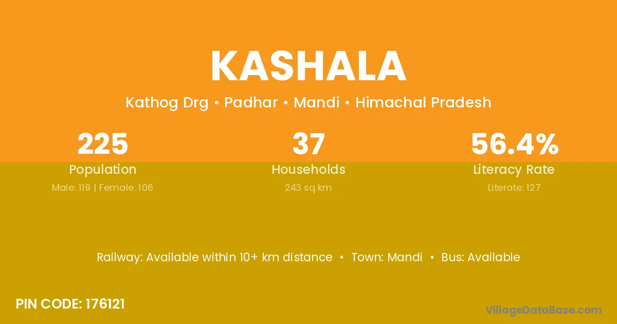 Kashala village has a total population of 225 people, of which 119 are males and 106 are females.