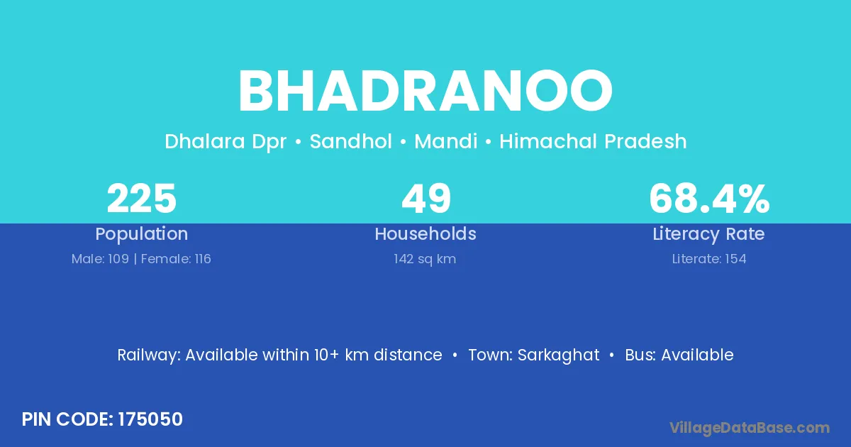 Bhadranoo village has a total population of 225 people, of which 109 are males and 116 are females.