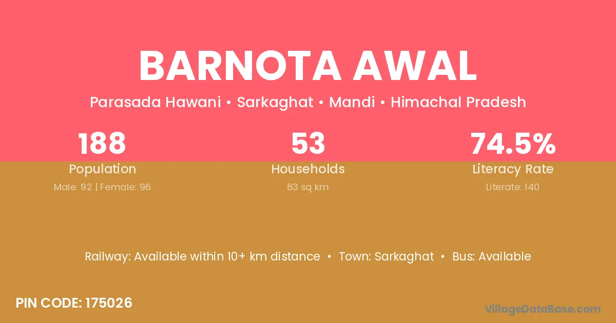 Barnota Awal village has a total population of 188 people, of which 92 are males and 96 are females.