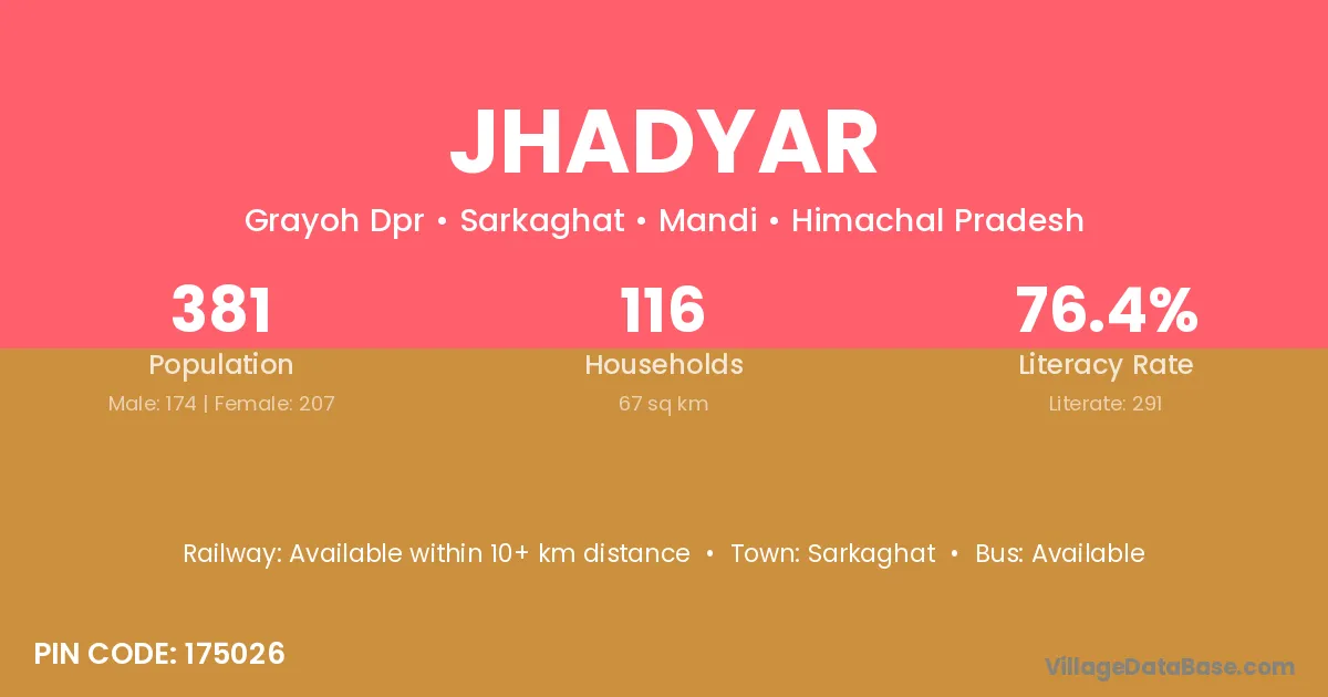 Jhadyar village has a total population of 381 people, of which 174 are males and 207 are females.