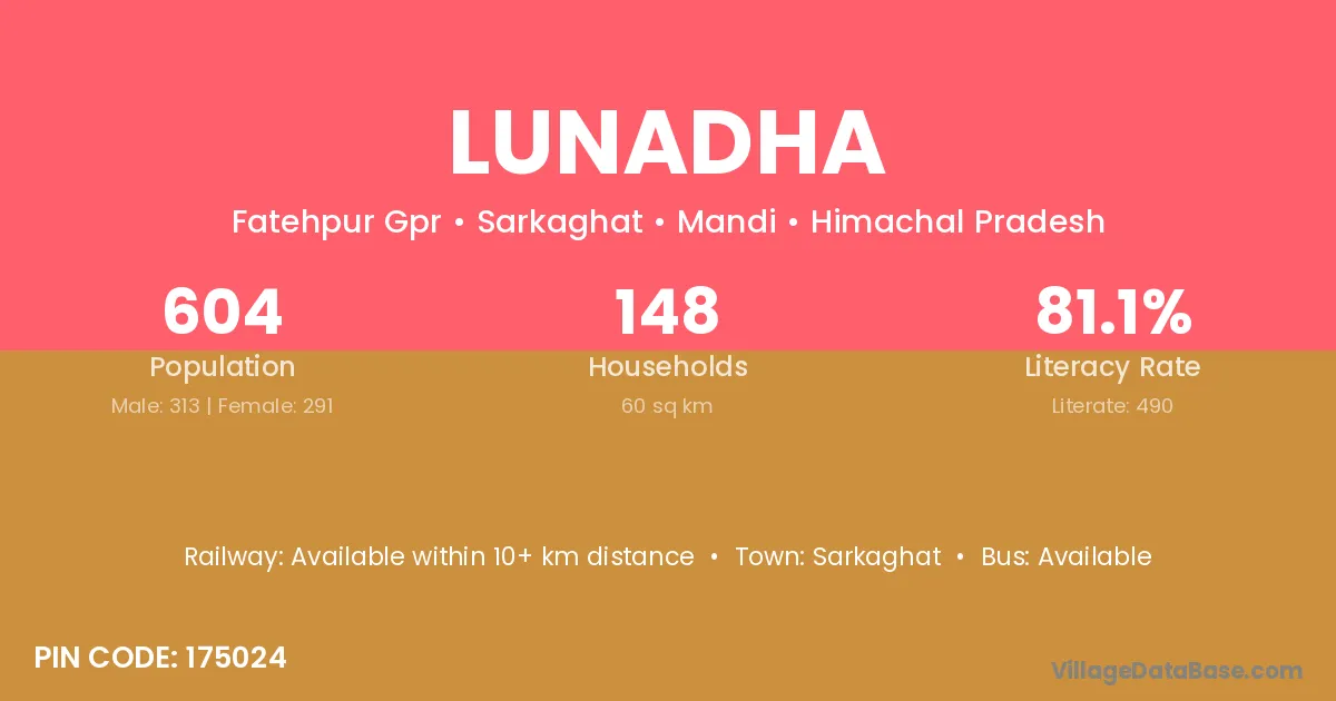 Lunadha village has a total population of 604 people, of which 313 are males and 291 are females.