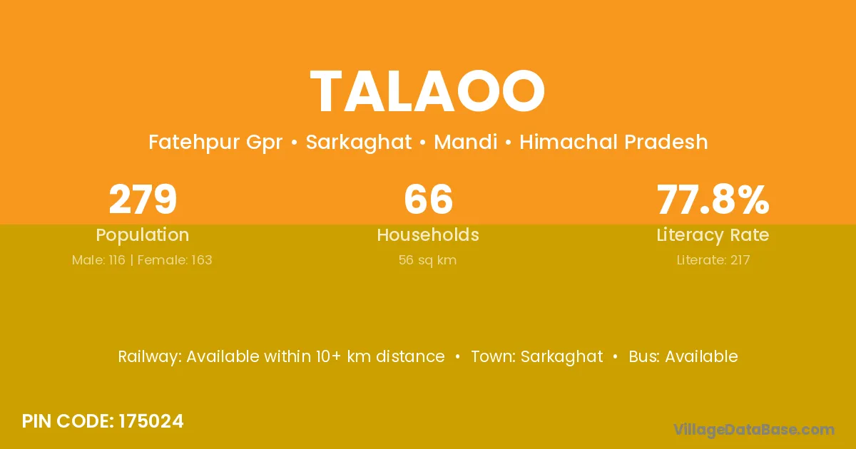 Sarkaghat is the nearest town to Talaoo village for major economic activities