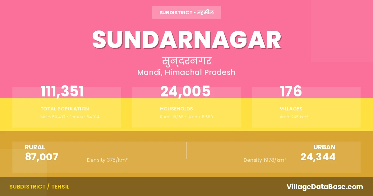 According to the 2011 census The total area of Sundarnagar Tehsil is 245 km², with a population of 111351 people. The population density is 455 inhabitants per square kilometre, and there are approximately 24005 houses in the sub district.