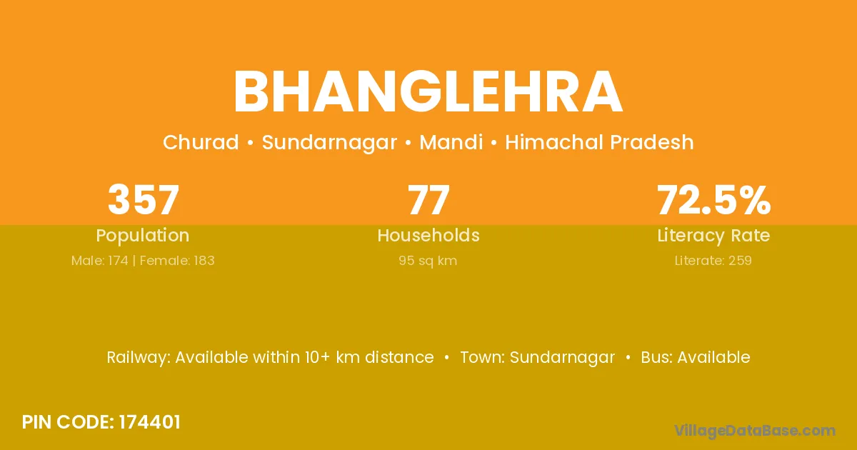Bhanglehra village has a total population of 357 people, of which 174 are males and 183 are females.