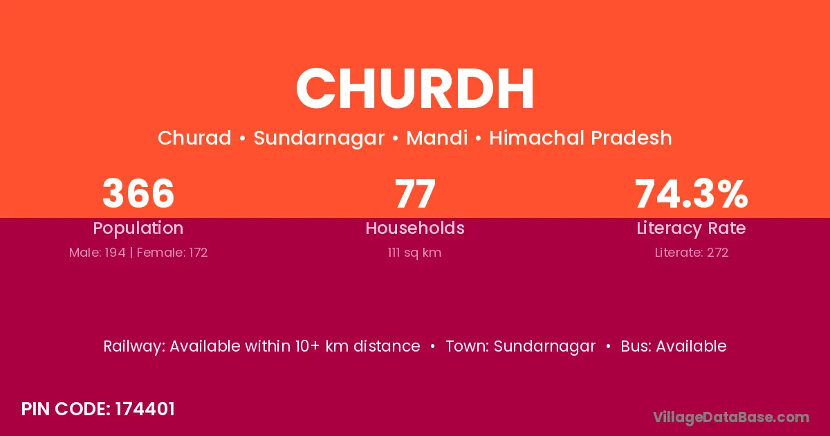 Churdh village has a total population of 366 people, of which 194 are males and 172 are females.