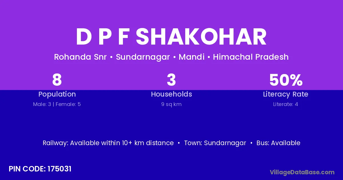 D P F Shakohar village has a total population of 8 people, of which 3 are males and 5 are females.