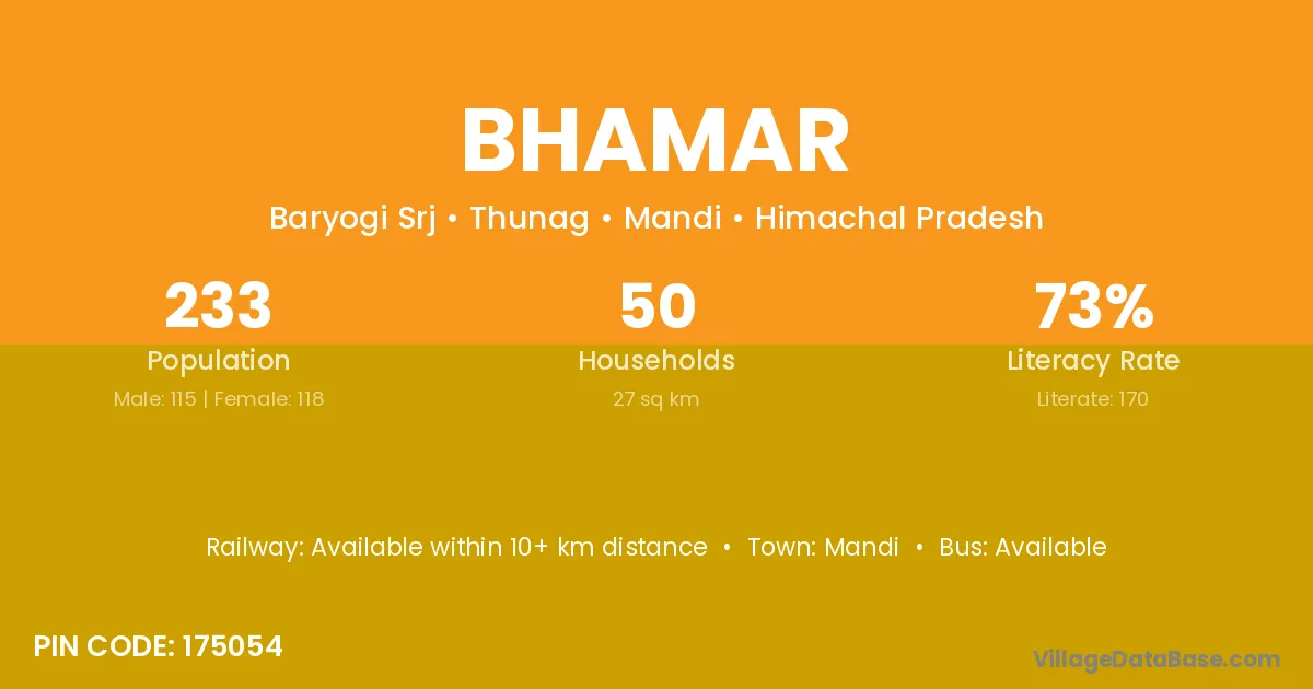 Bhamar village has a total population of 233 people, of which 115 are males and 118 are females.