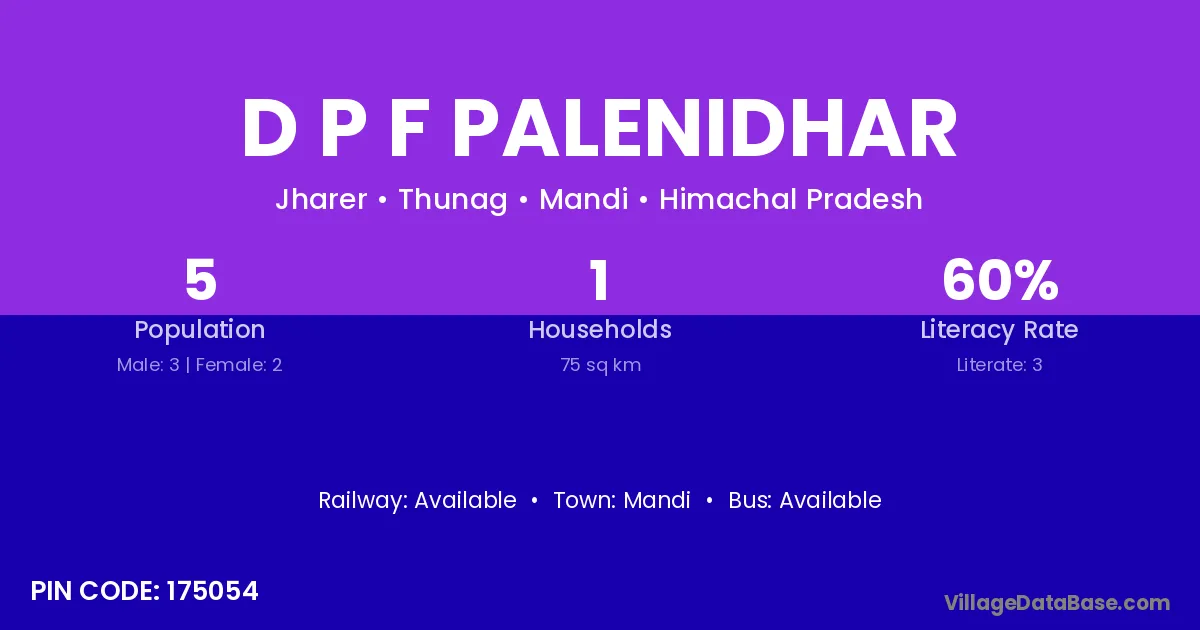 D P F Palenidhar village has a total population of 5 people, of which 3 are males and 2 are females.