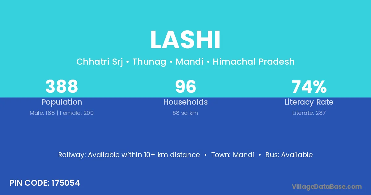 Lashi village has a total population of 388 people, of which 188 are males and 200 are females.