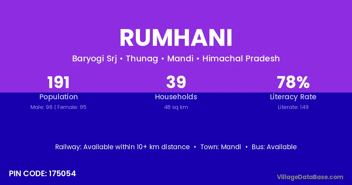 Rumhani village has a total population of 191 people, of which 96 are males and 95 are females.