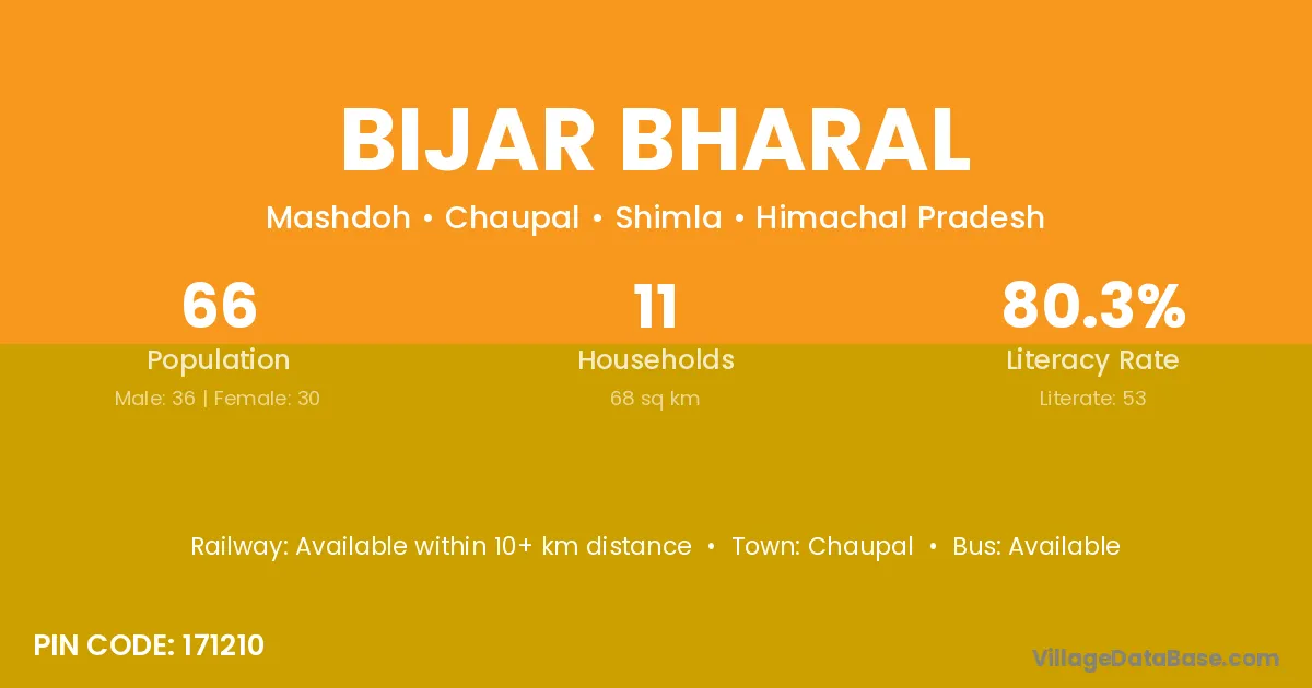 Bijar Bharal village has a total population of 66 people, of which 36 are males and 30 are females.