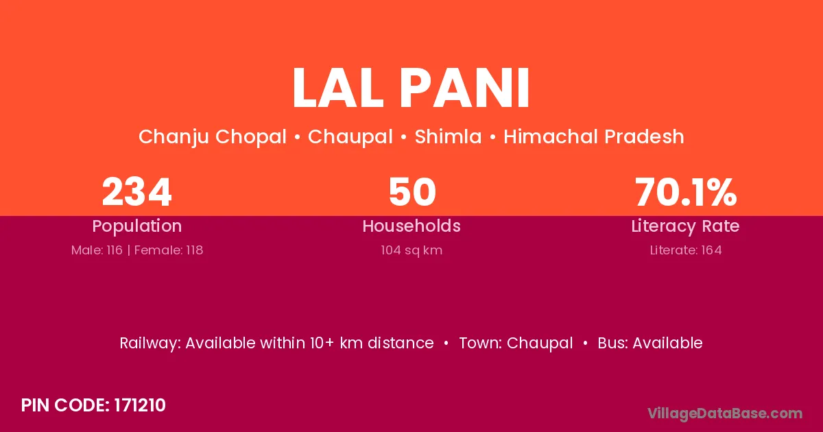 Lal Pani village has a total population of 234 people, of which 116 are males and 118 are females.