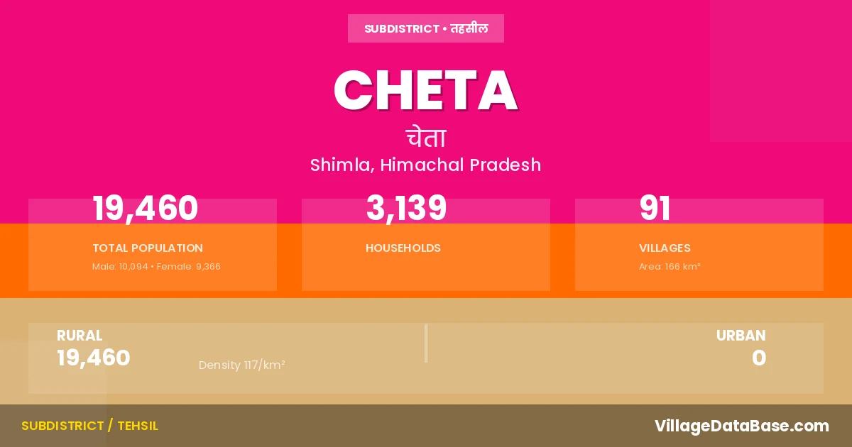 Cheta is a town and Tehsil in the Shimla district of the Himachal Pradesh. In India, a Tehsil is a subdivision of a district responsible for the administration and revenue collection of a specific area within the district. Tehsils play a crucial role in the local governance structure, contributing significantly to the development and administration of their communities.