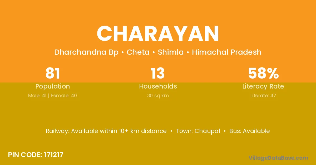 Charayan village has a total population of 81 people, of which 41 are males and 40 are females.