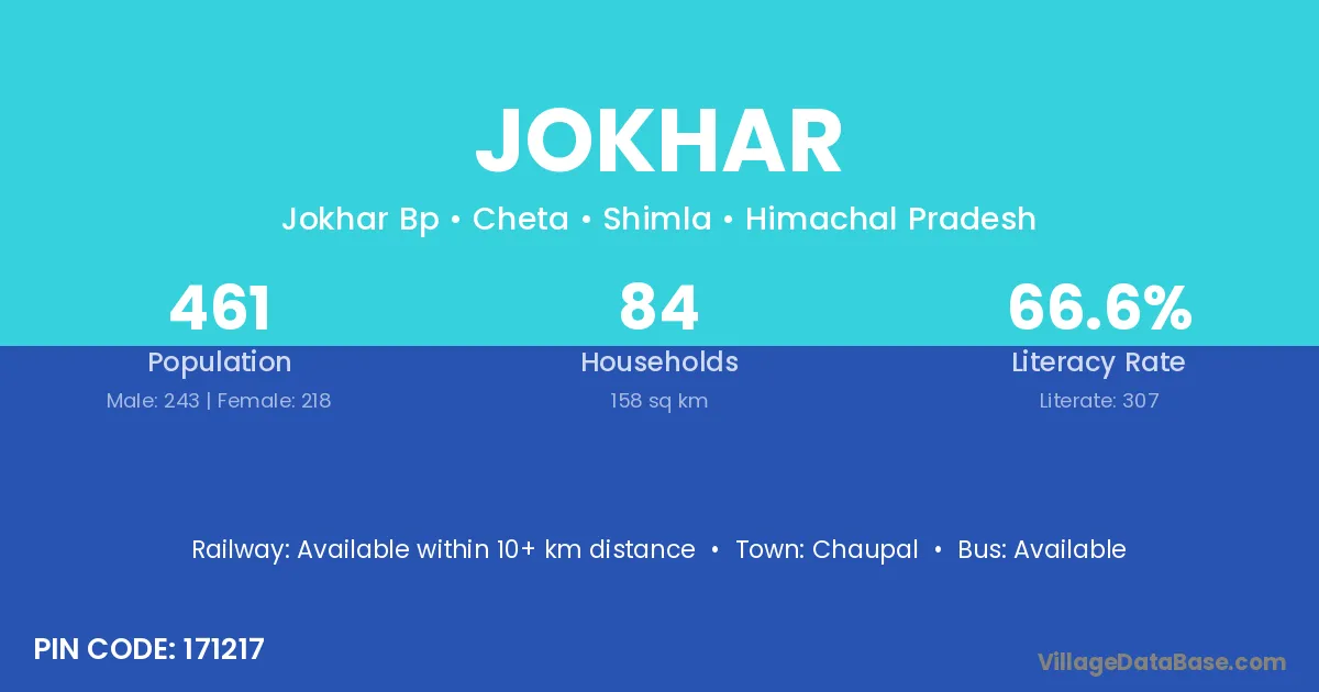 Jokhar village has a total population of 461 people, of which 243 are males and 218 are females.