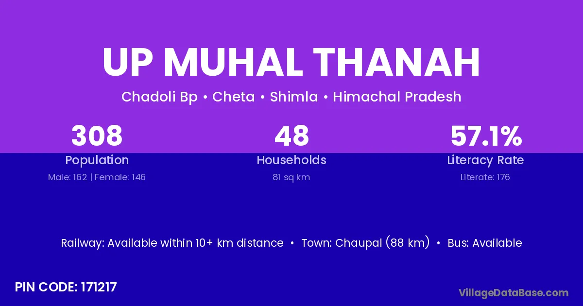 Chaupal (88 km) is the nearest town to Up Muhal Thanah village for major economic activities and is located approximately 88 km away.