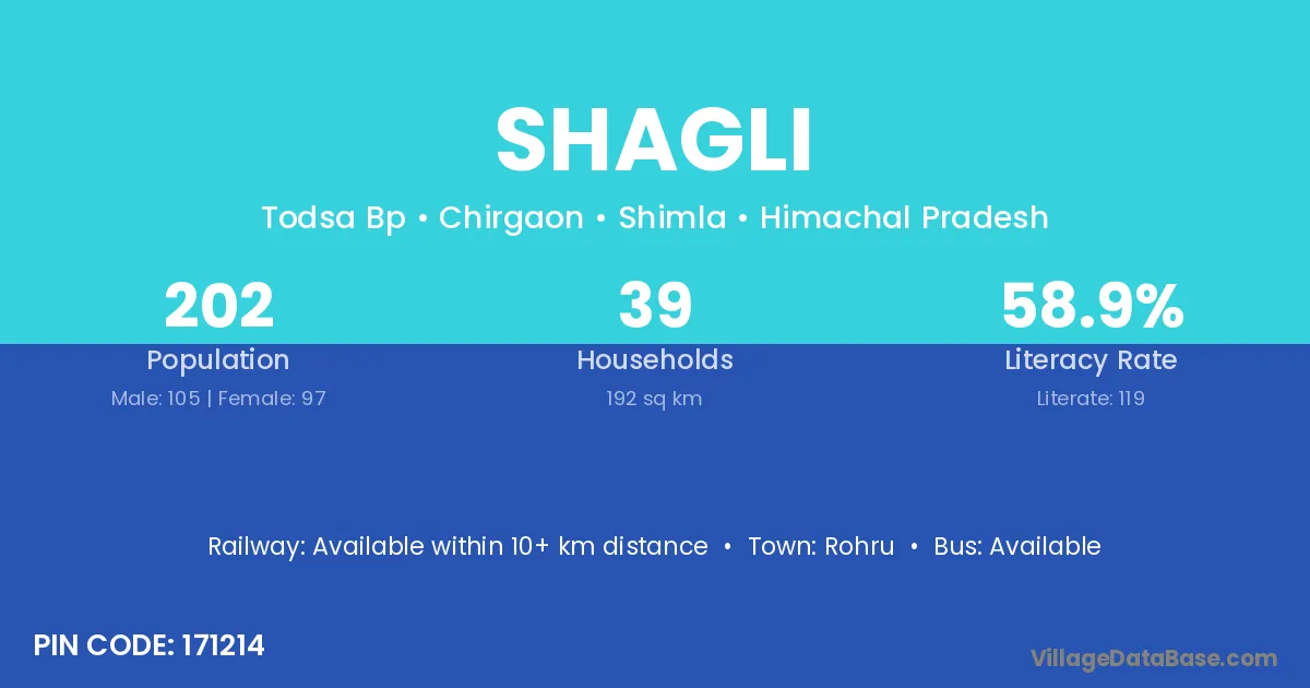 Shagli village has a total population of 202 people, of which 105 are males and 97 are females.