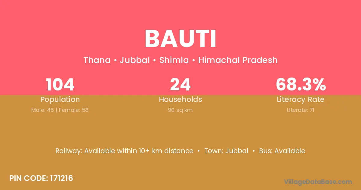 Bauti village has a total population of 104 people, of which 46 are males and 58 are females.