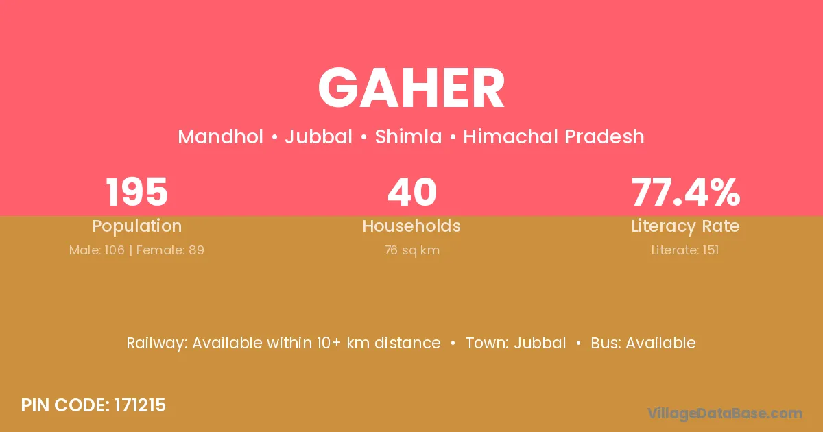 Gaher village has a total population of 195 people, of which 106 are males and 89 are females.